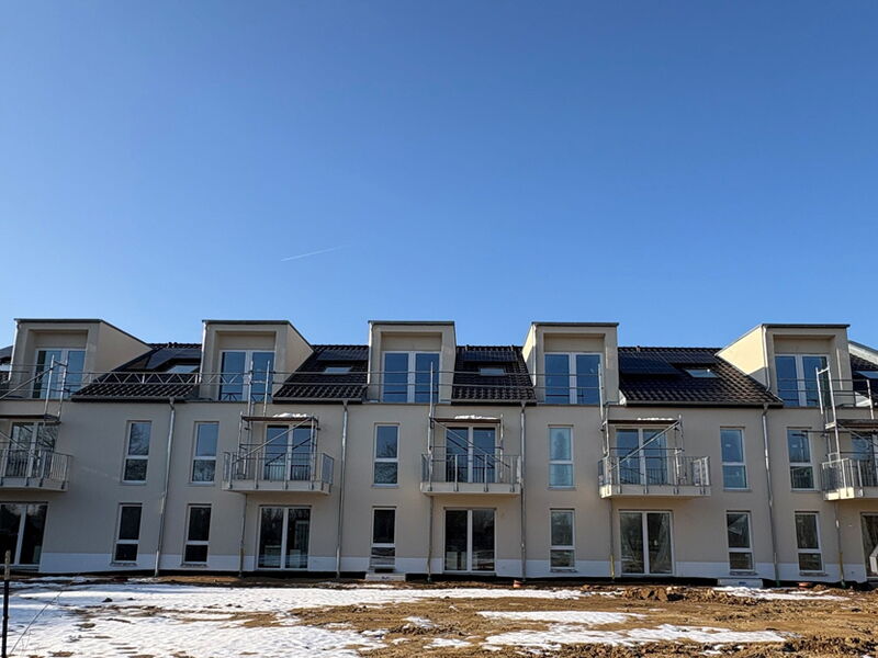 Die Fassadenarbeiten in Haus 1 und Haus 2 sind abgeschlossen und die Gerüste wurden vollständig demontiert. Auf den Dachflächen erfolgte die Montage der Photovoltaikanlage.