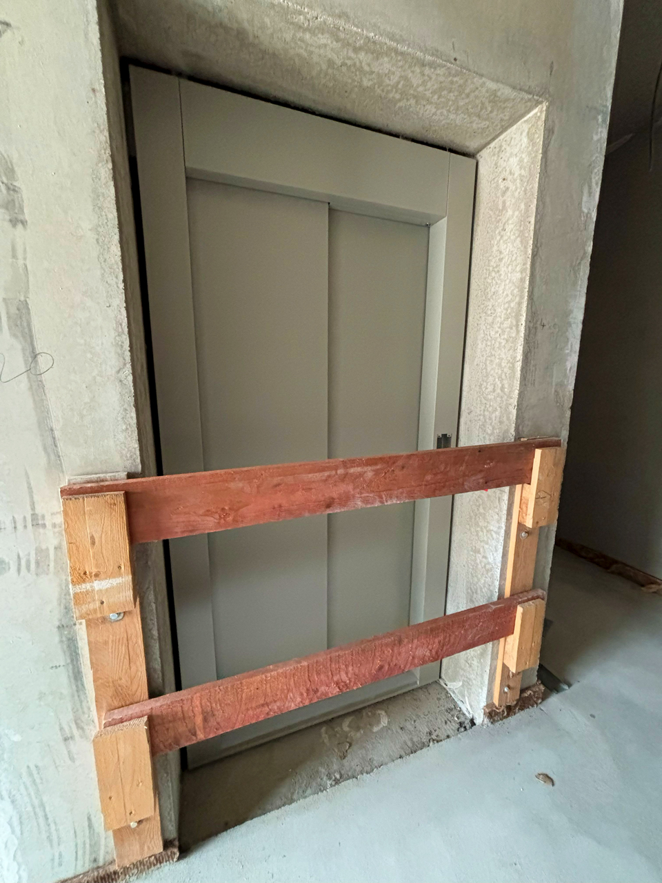 Jetzt kommt die Farbgestaltung der Fassaden nun besonders gut zur Geltung. Im Innenausbau wurden in beiden Häusern die Fußbodenheizungen installiert und der Estrich eingebracht. Ferner wurde der erste Aufzug eingebaut.